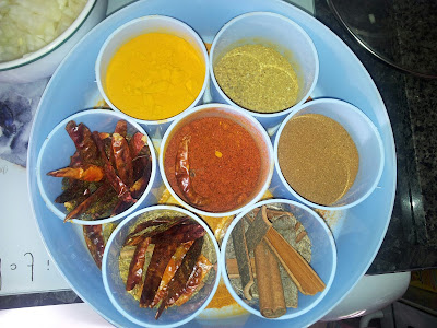 Every Indian house holds will have one of these in their kitchen. These have your every day spices in them like, Cinnamon sticks,ground cumin, ground coriander, mustard seeds,whole cumin, chilli powder and turmeric and also dried chilies( it's up to you)